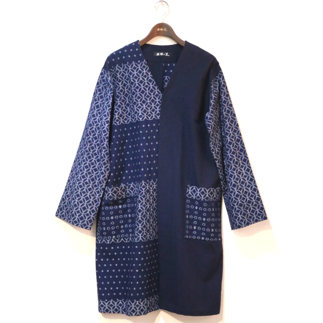 【Sale】木綿の花 [かすりの羽織 ロング丈] 久留米絣 七宝柄・泡ドット柄×無地 紺 ※柄部分:藍染手織り久留米絣使用 池田絣工房