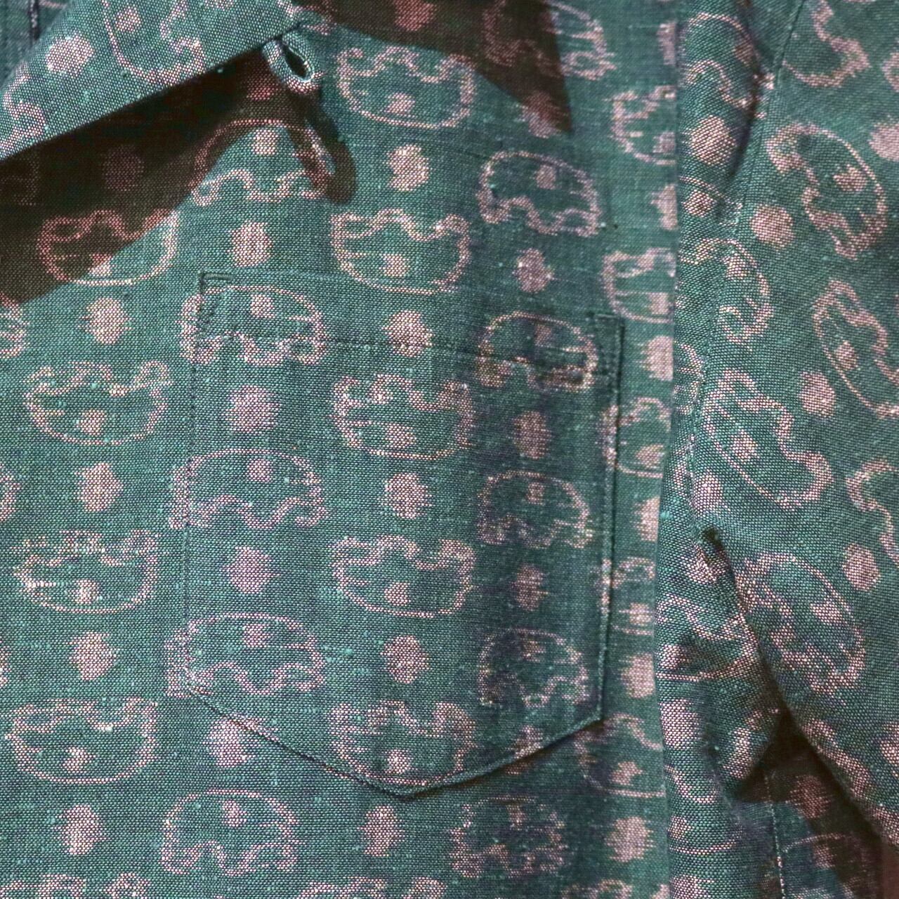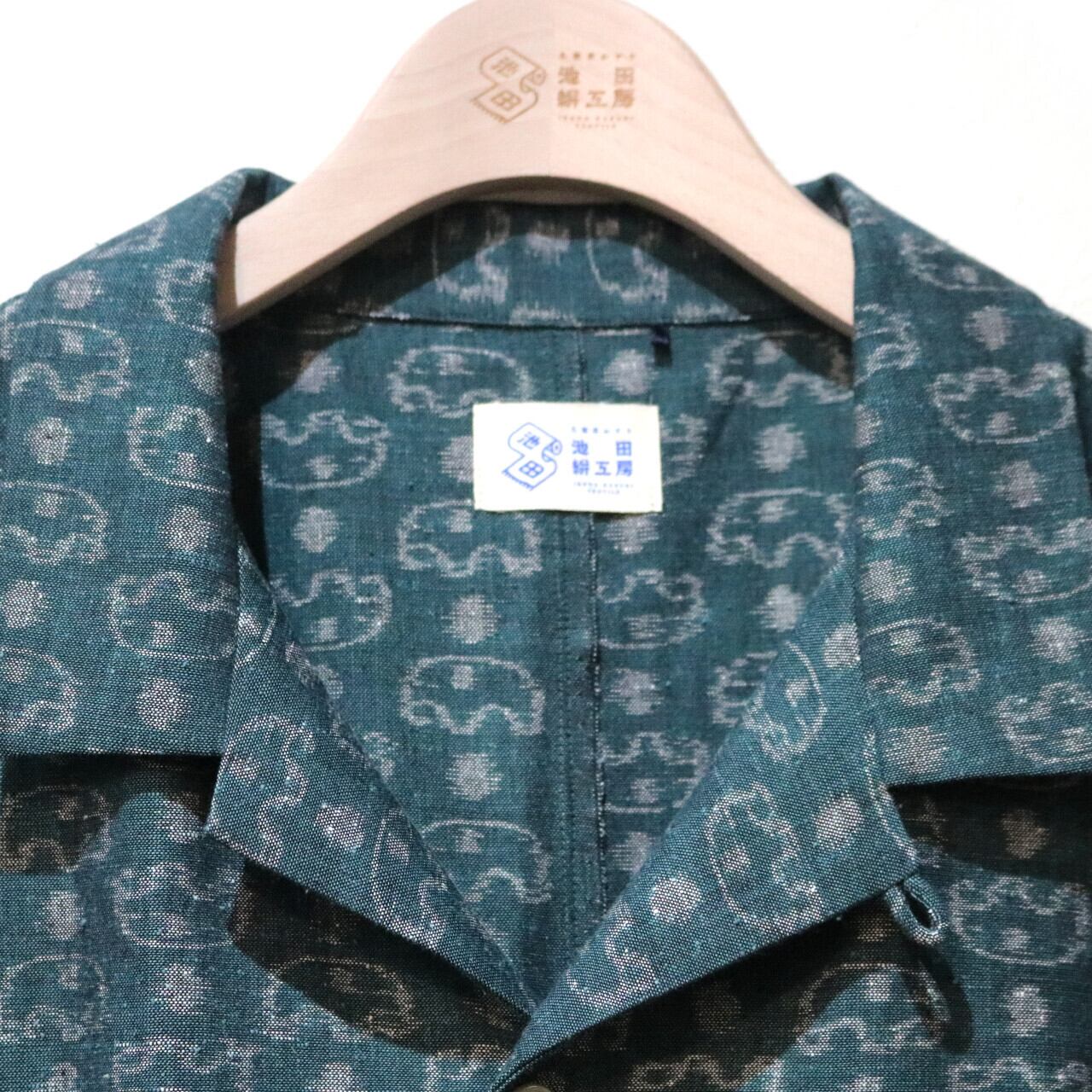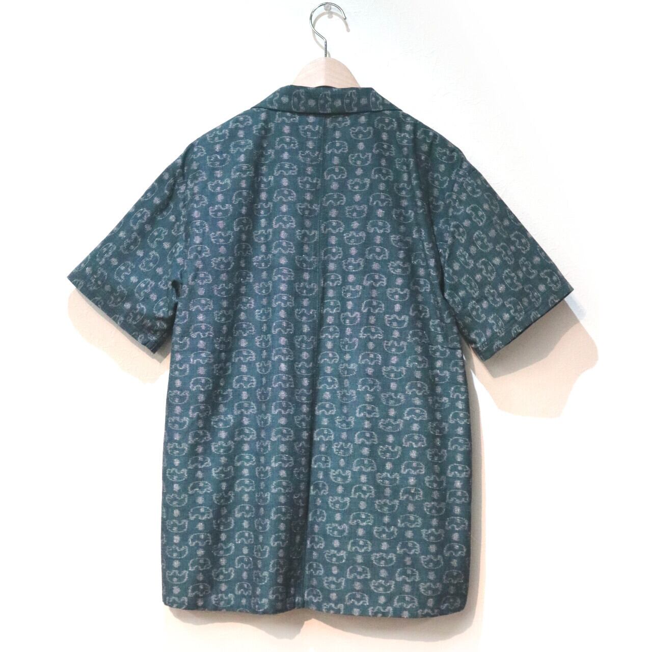 [メンズシャツ 絵絣 紳士Lサイズ] 手織り ぞうさん大行進柄 久留米絣使用 池田絣工房 開襟シャツ 半袖 グリーン