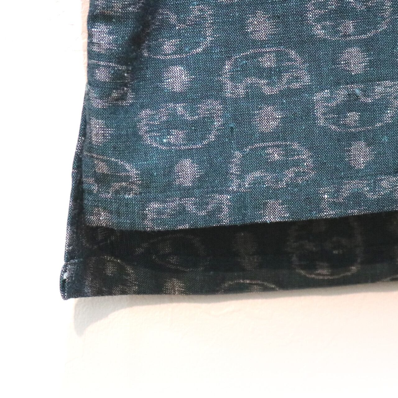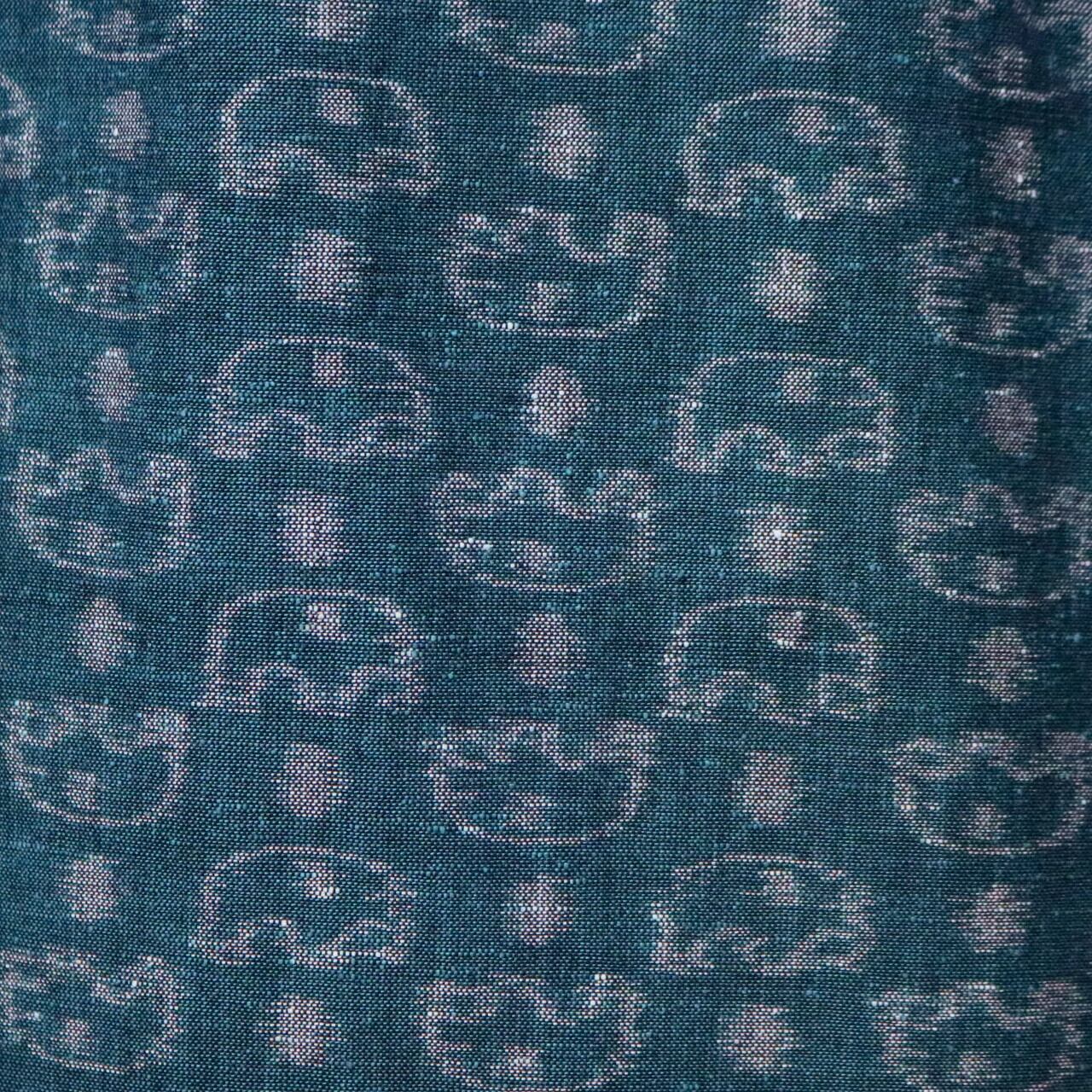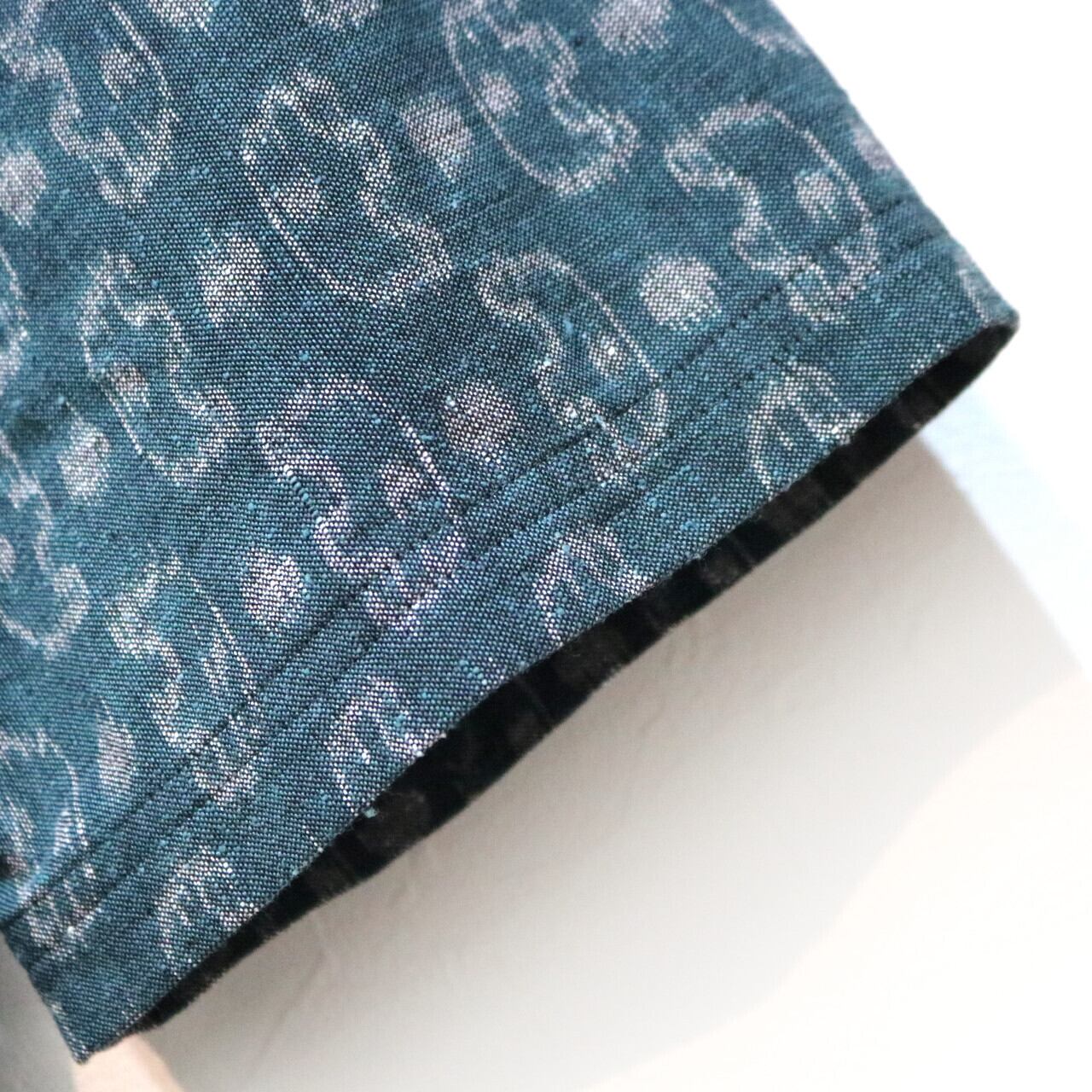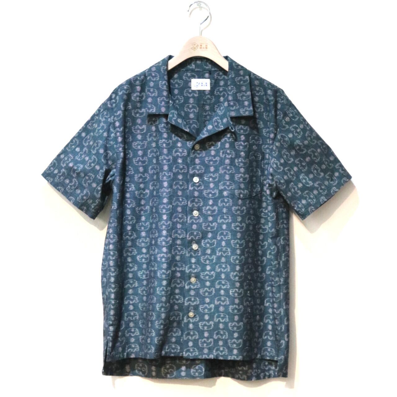 [メンズシャツ 絵絣 紳士Lサイズ] 手織り ぞうさん大行進柄 久留米絣使用 池田絣工房 開襟シャツ 半袖 グリーン