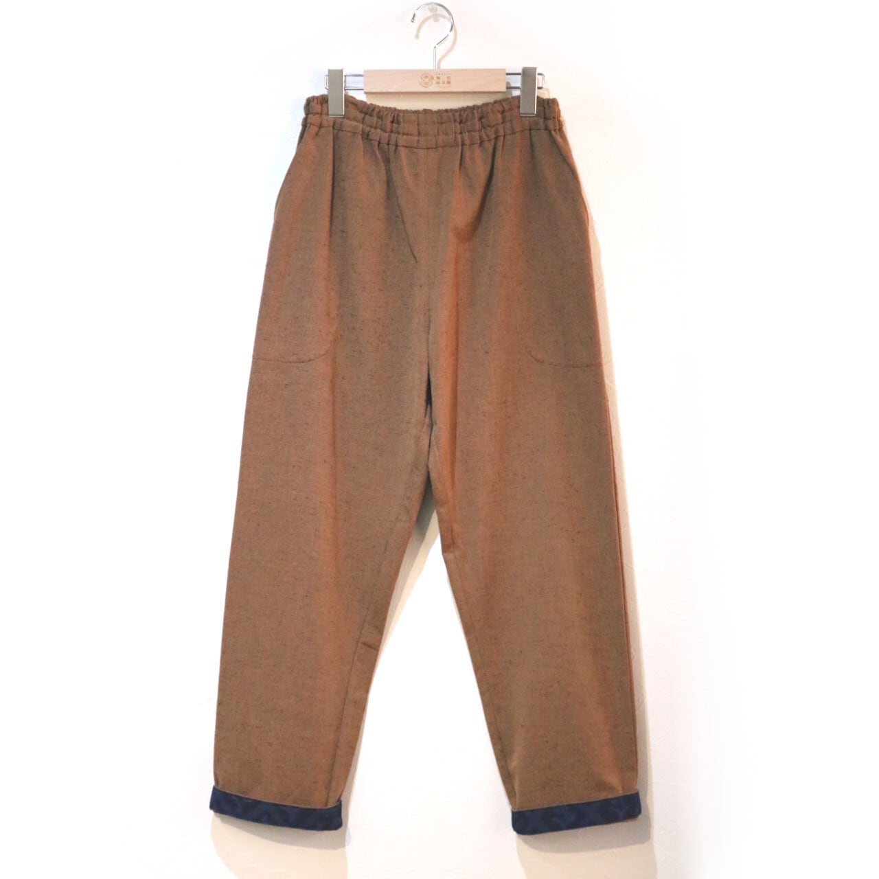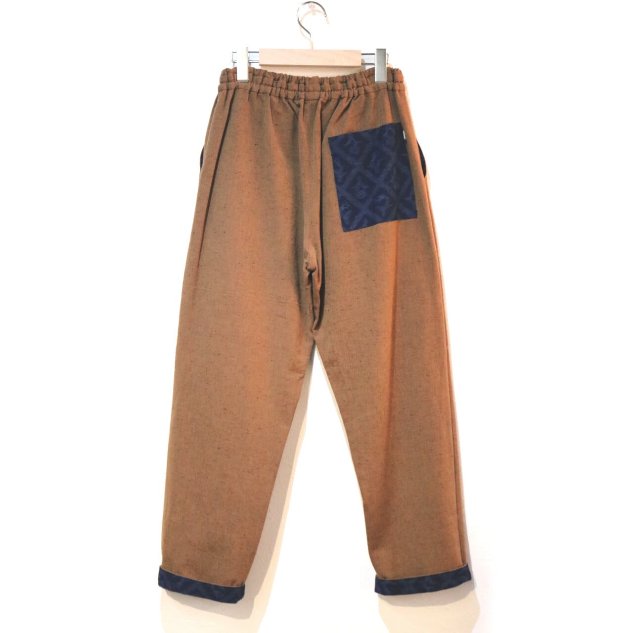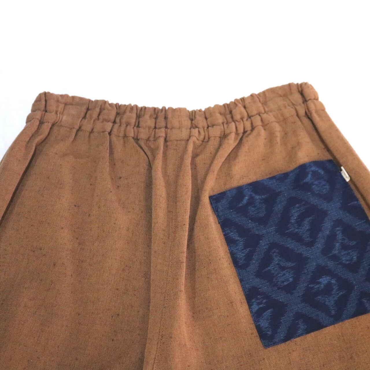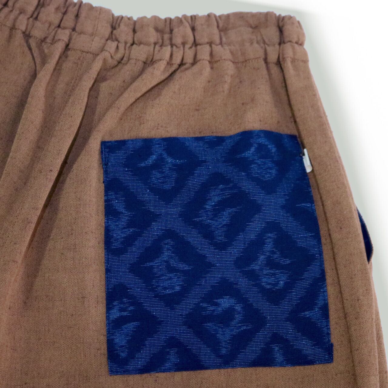 [かすり無地ズボン] 絣無地 ブラウン×蒼の花小路柄 もんぺ風パンツ ※柄部分:藍染手織り久留米絣使用 池田絣工房