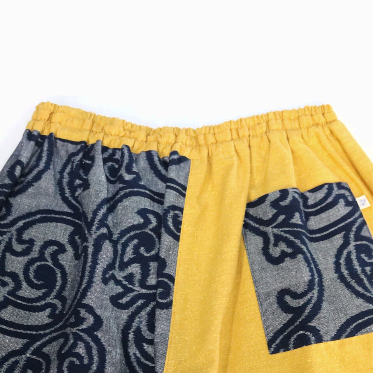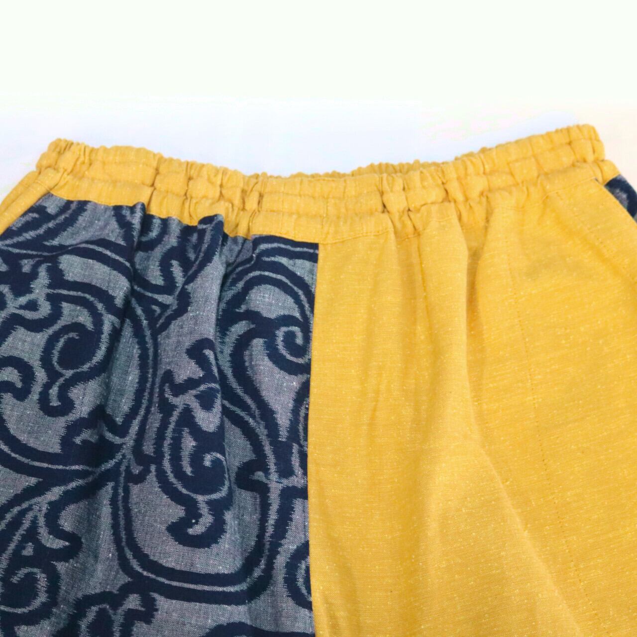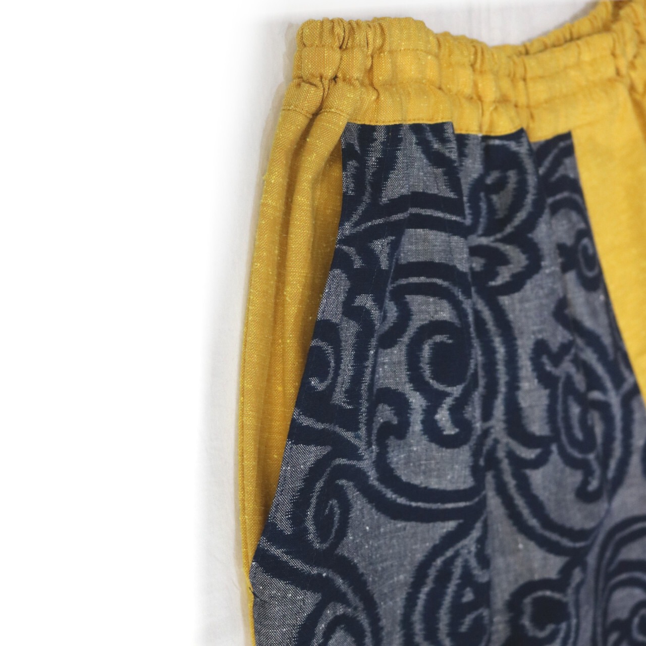 XLサイズ [かすりテレコズボン] 唐草柄×絣無地 イエロー もんぺ風パンツ 柄部分:藍染手織り久留米絣使用 池田絣工房