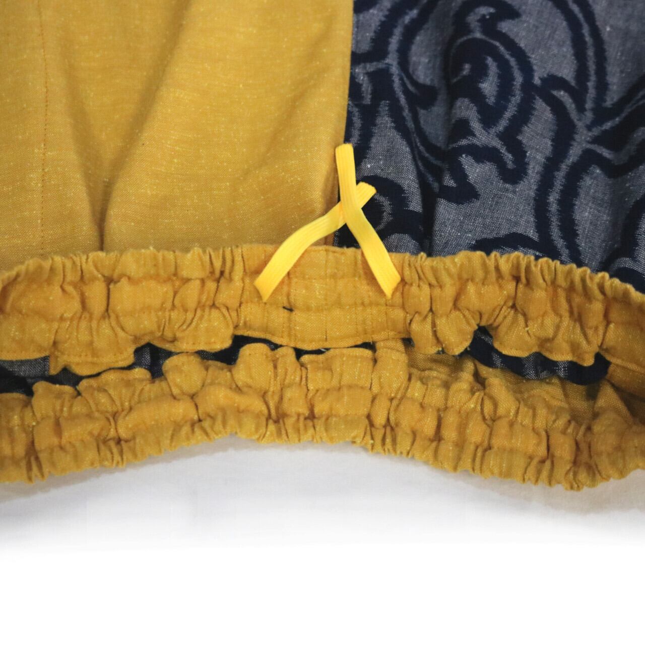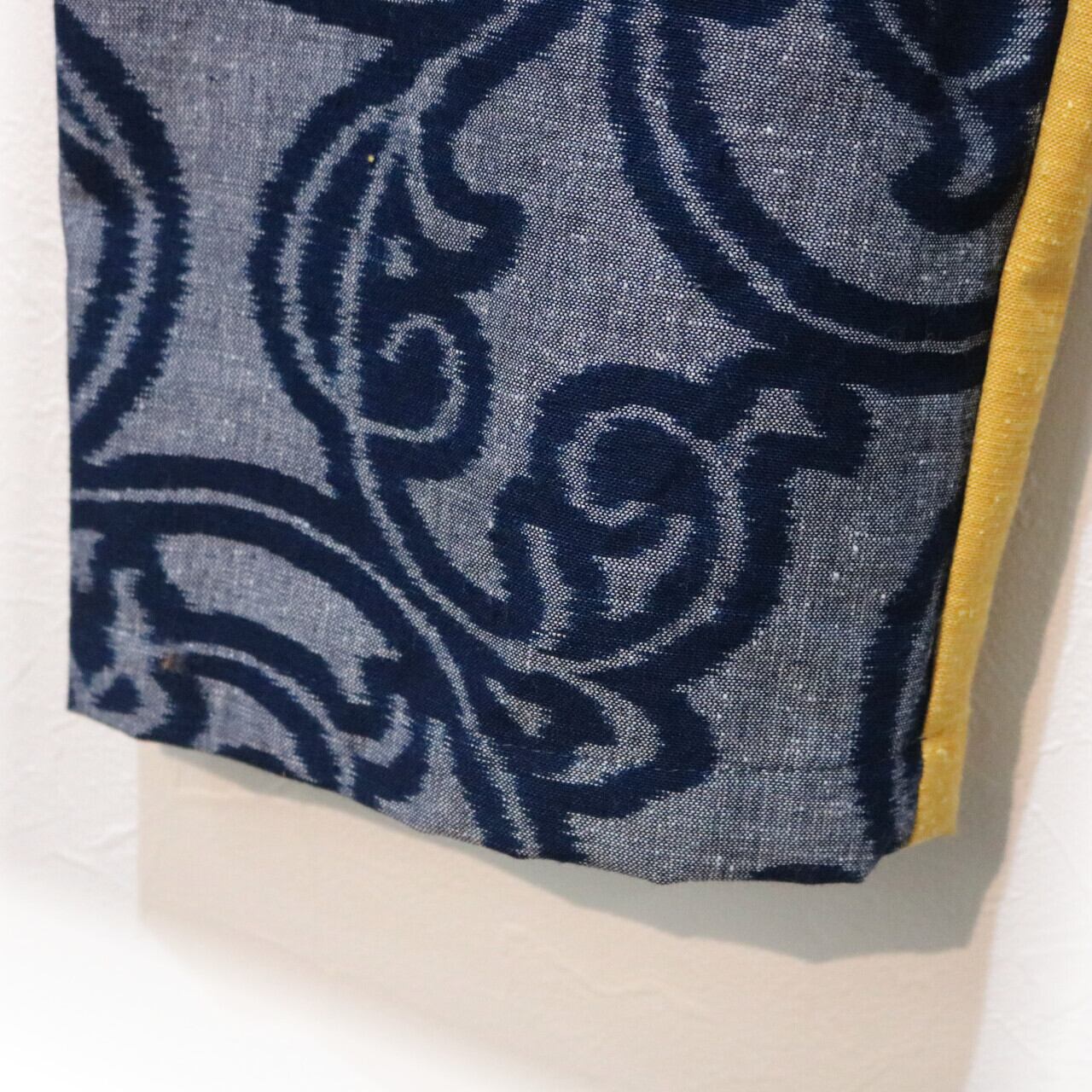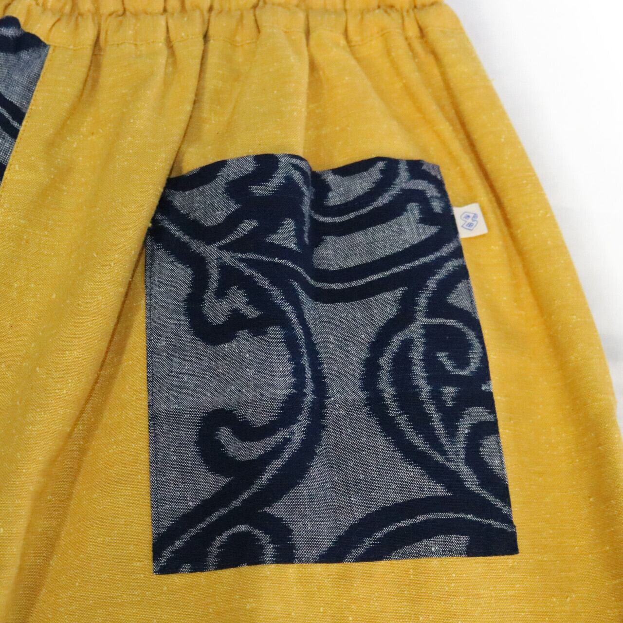 XLサイズ [かすりテレコズボン] 唐草柄×絣無地 イエロー もんぺ風パンツ 柄部分:藍染手織り久留米絣使用 池田絣工房